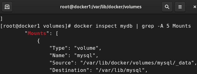 # docker inspect mydb | grep -A 5 Mounts