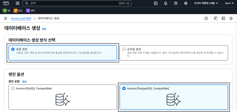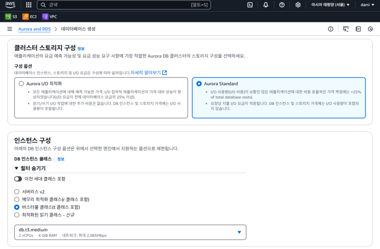 RDS > 데이터베이스 > 데이터베이스 생성 (=RDS 인스턴스 생성)