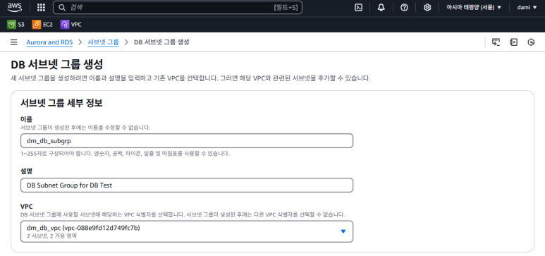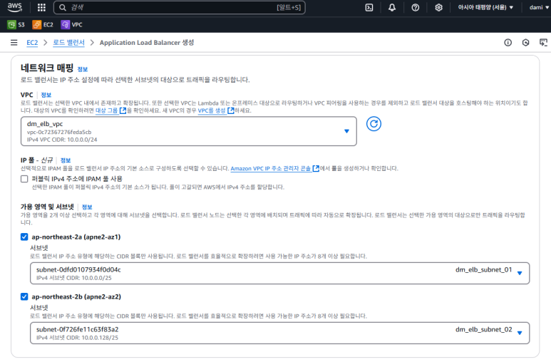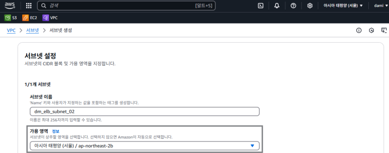 Subnet은 2개 이상, 가용 영역 다르게 설정 후