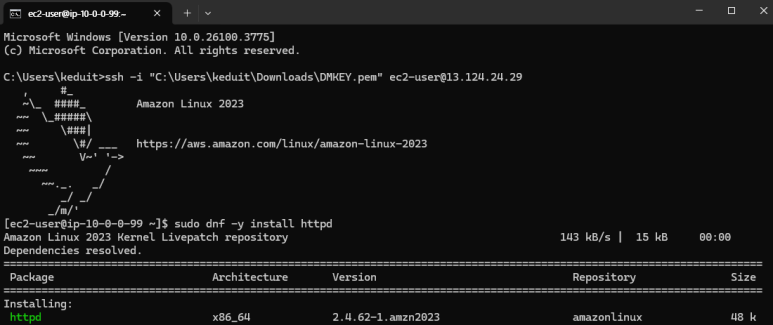 AWS EC2 인스턴스에 SSH로 접속한 뒤, Apache 웹 서버를 통해 웹 페이지가 정상 출력