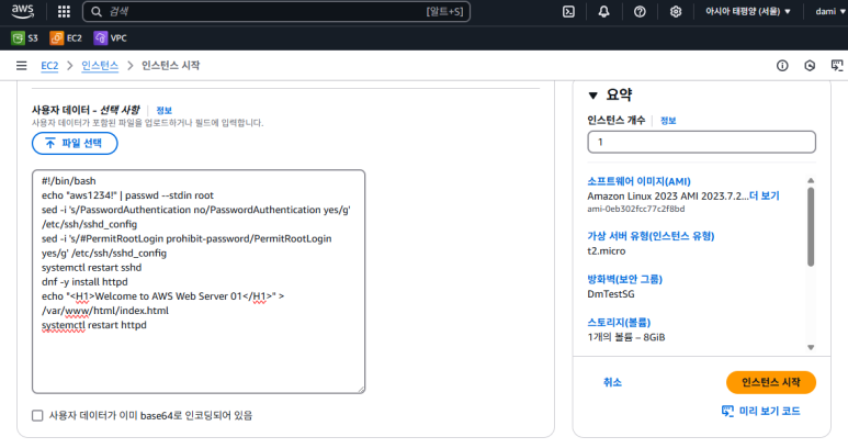 < AWS EC2 인스턴스를 생성하면서 사용자 데이터(User Data) 스크립트를 넣어, 자동으로 Server 세팅하고 웹 페이지 출력 >