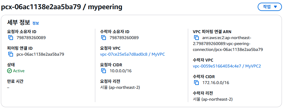 VPC Peering으로 각각 연결 시 통신 확인 가능하다.