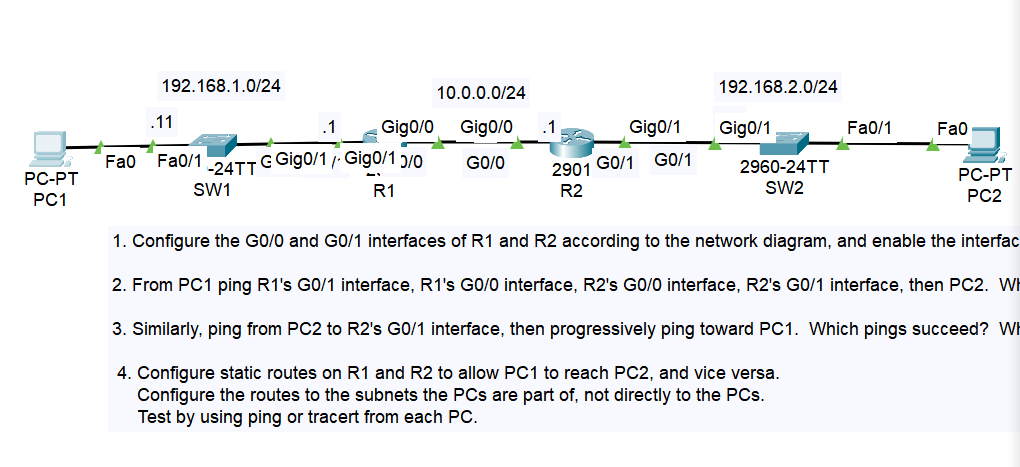 라우터 1과 2는 서로 연결되어있고, 각각 연결된 192.168.1.0 네트워크 대역 2.0 대역만 알고 있는 상태이다.